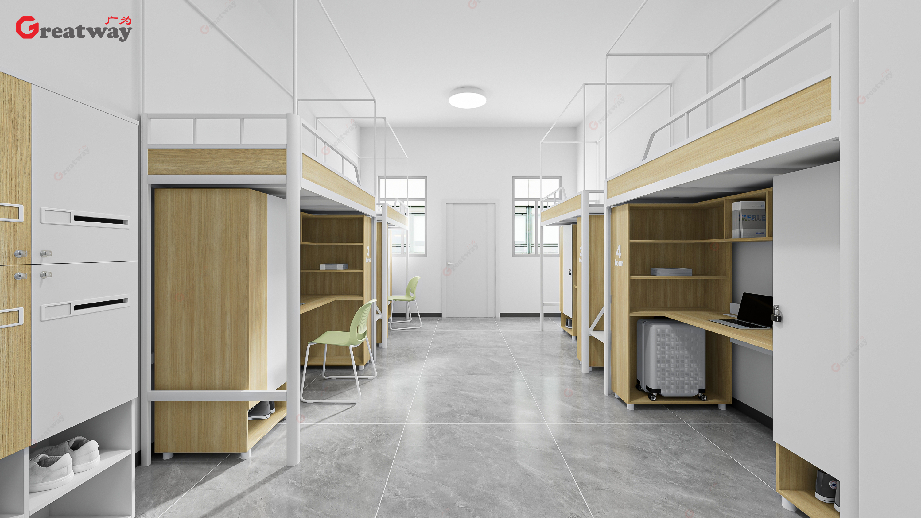 上鋪采用寬敞設計,確保每位學生都能擁有舒適的睡眠環境;而下鋪則巧妙地轉化為學習區域,配備有寬敞書桌,既保持了宿舍的整潔有序,又極大地方便了學生的日常學習,讓學習與休息在同一空間內和諧共存,提升了整體的居住品質。
